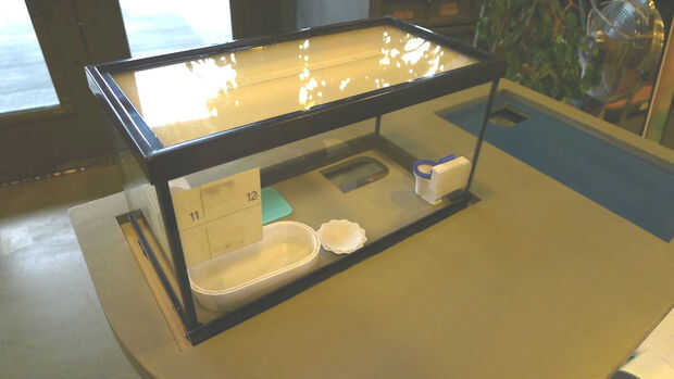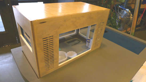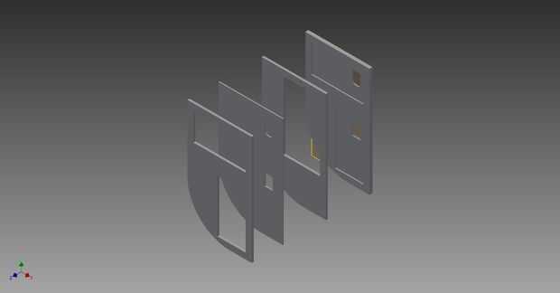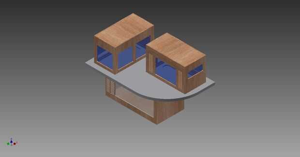 En primer lugar, había modelado unos tamaños de acuarios de vidrio en Inventor y había diseñado cajas de madera que anidado sobre ellos. También modelado una manera para ellos sellar a una superficie plana que actuaba como un separador entre los niveles superior e inferior de la casa. Junta adhesiva negro es palo hasta el borde de los acuarios pequeños para hacer el sello. Esta "terraza" es un sandwich de 2 piezas de madera contrachapada de 1/2" con un 1/4" pieza en el centro. 1/2" espesor rebanadas tienen rectángulos cortadas que los acuarios. Hay dos pasillos de las escaleras conectar el bajo a acuarios de nivel superiores. Las imágenes muestran cómo encaja la Asamblea.