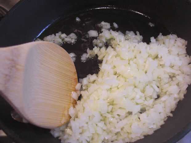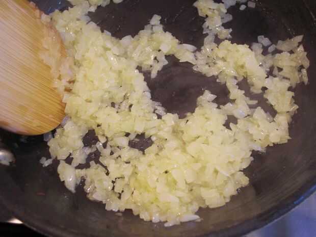 2. Freír cebolla y ajo en la sartén en temperatura media hasta que se vuelvan translúcidos. Ponga la cebolla y el ajo en un recipiente y deje enfriar.