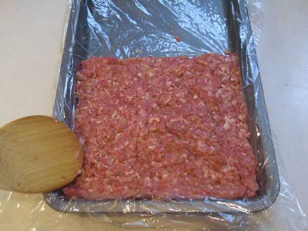 4. Coloque el film transparente sobre el fondo de la bandeja. Llenar uniformemente el relleno con profundidad de 1cm en la bandeja de