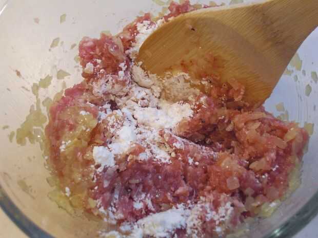 3. Añadir la carne picada de cerdo, caldo de pollo, sal, pimentón y harina de maíz en el recipiente. Mezclar todos los ingredientes en el tazón de fuente