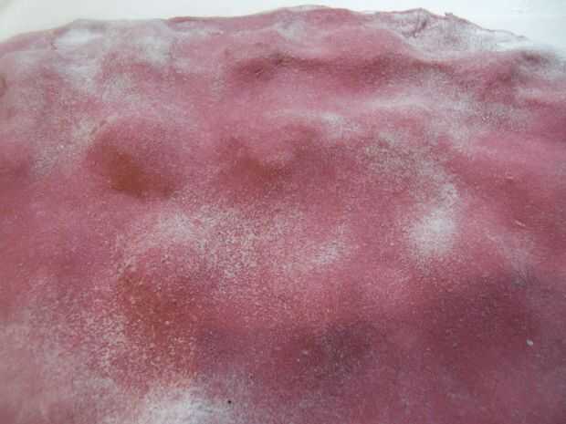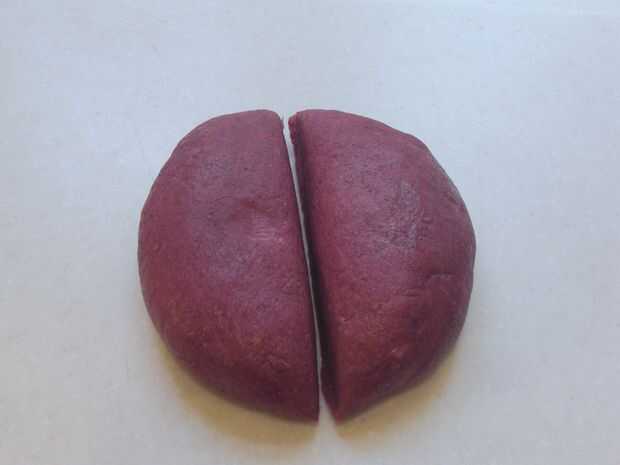 - Cortar la masa rosa en la mitad. Envuelva la mitad con un film transparente