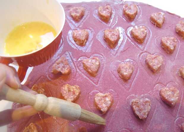 - Aplicar huevo batido con un pincel para rellenar los bordes entre presentación y exterior corazón forma de Loveoli