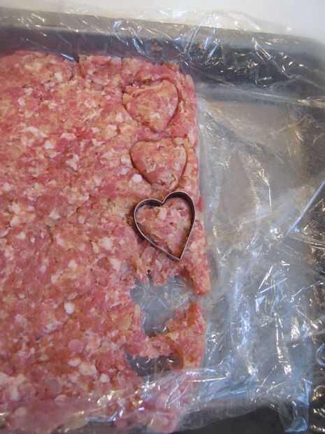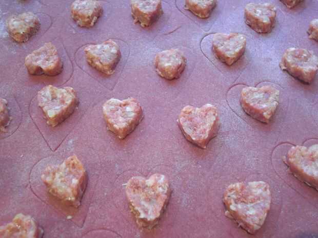 - Sacar el relleno de la nevera y hacer la forma de corazón con la plantilla pequeña. Coloque cada pieza de relleno en el centro de un espacio de Loveoli trazado
