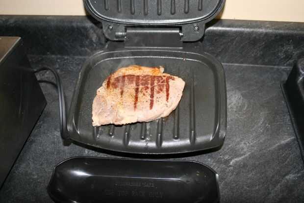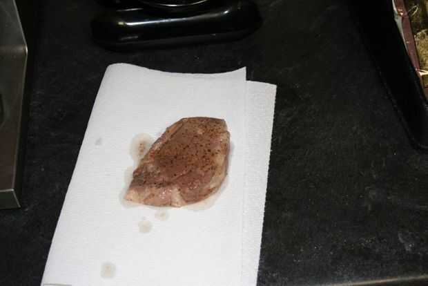Sólo toma un minuto o para que la plancha alcance la temperatura. Mientras espero, corte la bolsa, drenar el líquido en el fregadero, pat la carne seca con una toalla de papel y tirarlo a la parrilla.
