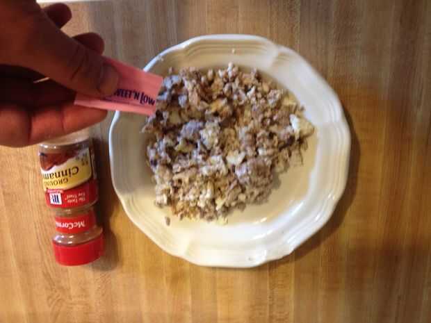 Claras de huevo son bastante sosas, añado un paquete de dulces y bajos en la parte superior. Es especie de un canela y azúcar desprender. Hace el truco, pero se puede experimentar.