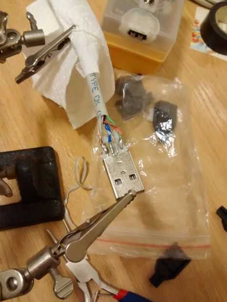 Aquí el único requisito es una habilidad un poco decente con pegamento caliente, simplemente eso. Desde las entrañas de la concha femenina son algo más grandes que lo requiere el enchufe macho para montar, después de alambre de soldadura del enchufe, una capa cuidadosamente medida de pegamento caliente se debe repartido dentro y, rápidamente, el enchufe es cuidadosamente aterrizó, teniendo un ojo en mantener el tapón en la altura correcta. Como había dejado una leve cicatriz en el lado del conector macho (en las entrañas detrás del enchufe, cerca de las pestañas de cable), algo supuestamente en aproximadamente a media altura, esto me ayudó para asegurarse de que el enchufe ser perfectamente centrado en el entre ambos lados de la cáscara. Este deber de posicionamiento fue alcanzada principalmente con mi dedo sobre el extremo del cable a la entrada de enchufe. Una vez lograda esta parte más difícil, una buena capa de pegamento caliente en el otro lado de la cáscara y... cierre para arriba!