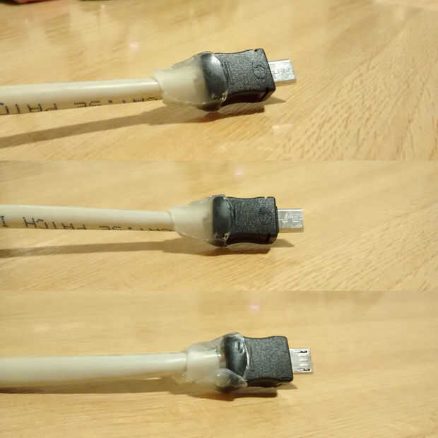 Sólo una actualización no tan importante. Con el paso del tiempo, de alguna manera la chaqueta del cable se deslizó fuera de la cáscara micro-USB (maldito! Era caliente pegado desde el interior!). Por supuesto podría han reconstruido todo pero en su lugar, he opté por algunos creatividad pegado en caliente para evitar cualquier posibilidad de alambre estrangular. Cinta adhesiva aceitado fue utilizado para dar a algún tipo de forma elegante a la cosa. (-: