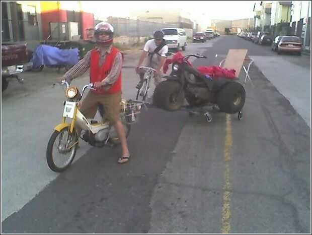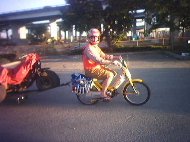 El gancho de remolque es un empalme universal formado por otro amarre de cámara. Esta había conectado el acoplado a la parte posterior del ciclomotor de Ryan. Hay algunos cuerda como innertube en ese amarre porque era secreto miedo de que caer.
