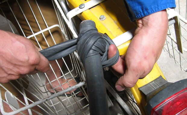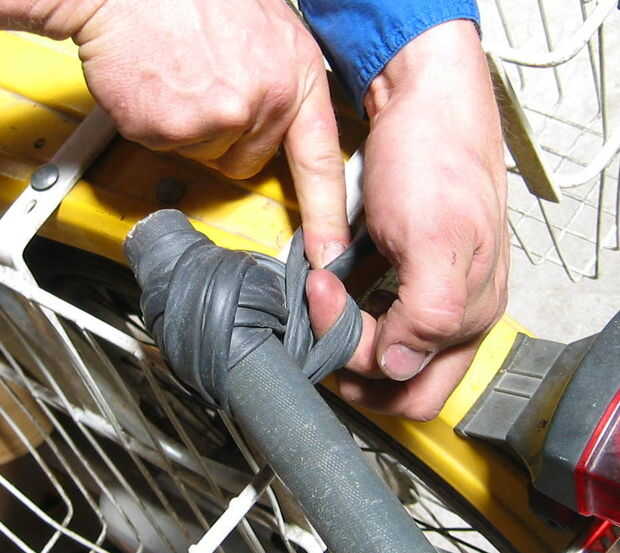 La primera vuelta pasa un extremo del tubo, atrapándolo.