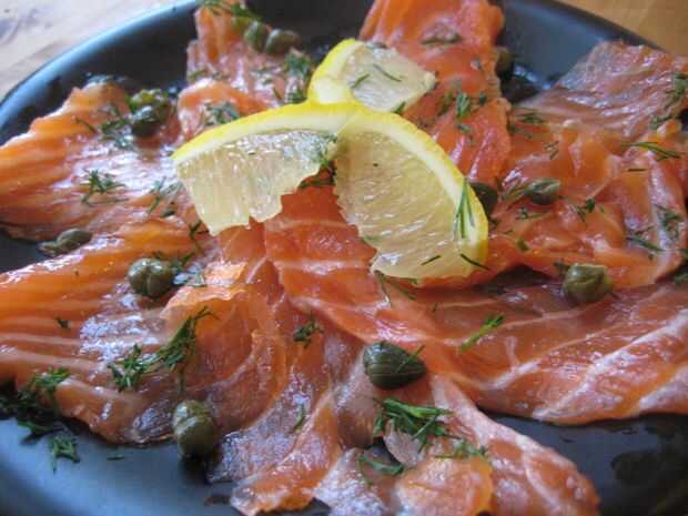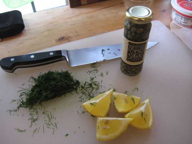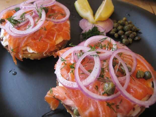 Haz un ligeramente tostado todo bagel (de NY si es posible) y cubierta con crema de queso. Pegue algunas alcaparras a la crema de queso, que se mantienen en su lugar para que no caiga el bagel (problema común). A continuación, cargar el bagel con lox, no demasiado, pero no demasiado poco. Tal vez 3-4 piezas. En la parte superior el lox va laminas de cebolla morada (de modo que no hay que tocar el lox directamente con los dedos mientras está comiendo el bagel (sólo un problema si eres un fan del bagel abierto de la cara), jugo de limón, un toque de sal y pimienta y eneldo fresco más.