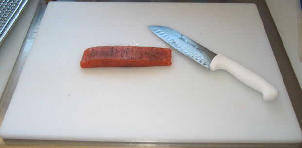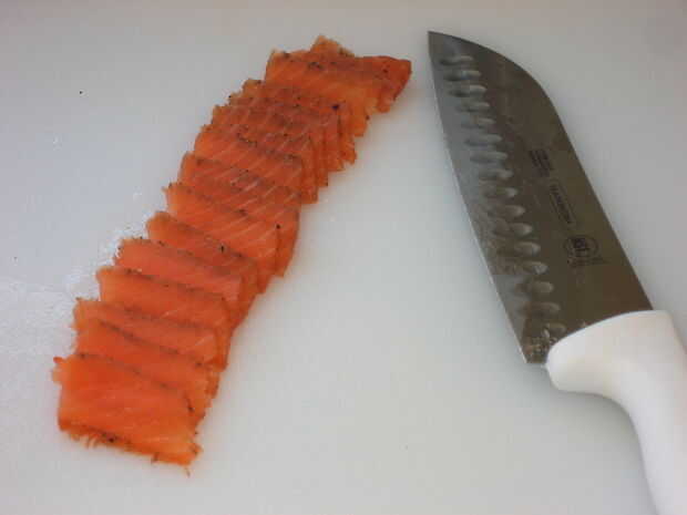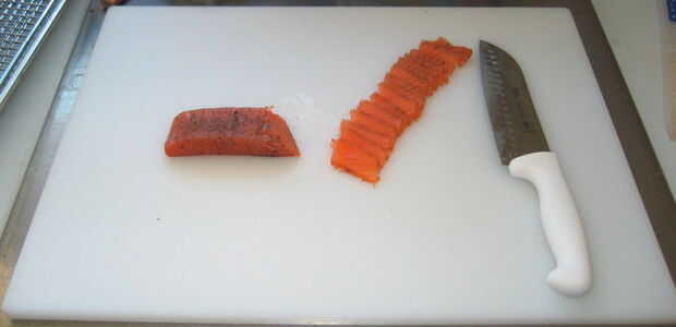 El cuchillo más agudo y la corte contra el grano tan fino como sea posible sin ripeo el filete. Desde aquí usted tiene muchas opciones. Comer normal, hacer una especie de frío eneldo salmón dip, pone un poco en una pequeña bola de arroz y lo llama sushi o componen algunos bagels, queso crema, alcaparras y eneldo y llamada lo desayuno.