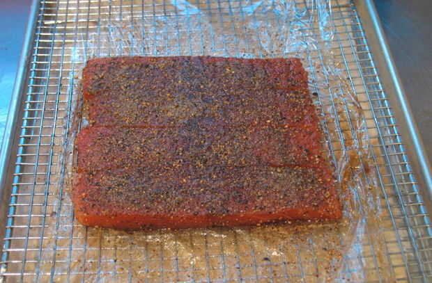 Borbón tocino casero de salmón ahumadoPaso 1: la curación por 36 horas crio vac salmón y curación en la nevera por 36 horasPaso 2: salmón curado curar salmones en puré crujiente tocino, azúcar, sal, bourbon, jarabe de arce y pimienta negraPaso 3: pel