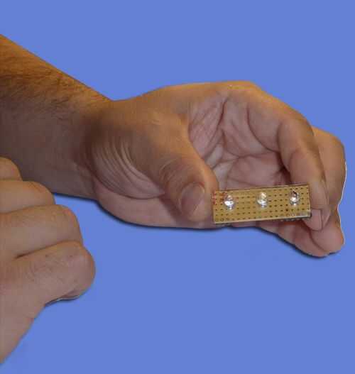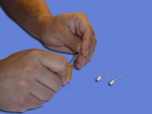 Ahora le añadimos los LEDs, afortunadamente tenemos unos LEDs ultrabrite en la caja de piezas (basura de piso), azul, verde y blanco. Hubiéramos preferido rojo pero tenemos que ver con lo que tenemos! Por suerte lo suficiente el espacio es perfecto! Si usas éstas cristalinas no duele para escribir el color del LED en la base ya que todas tienen el mismo aspecto en el Banco.
