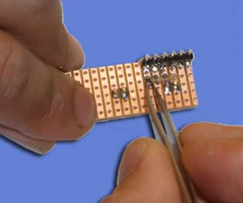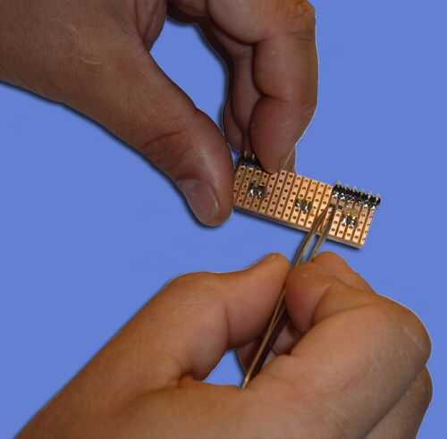Sólo tenemos resistencias de montaje superficial en el valor que se requieren (270 ohmios), por suerte bastante esto sucede con frecuencia por lo que hemos desarrollado una técnica un poco para que sea fácil de usar estos, de hecho son más fácil y más limpio que a través orificio así considerarlo. Básicamente, perfore la veroboard en la forma habitual. Poner un poco de pasta de soldadura en cada lado del agujero. Soldadura por igual pero tener cuidado porque las resistencias podrían tratar de saltar antes de la soldadura refresca, así que mantened un pasador o unas pinzas útiles para mantenerlos en su lugar.