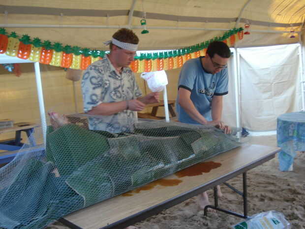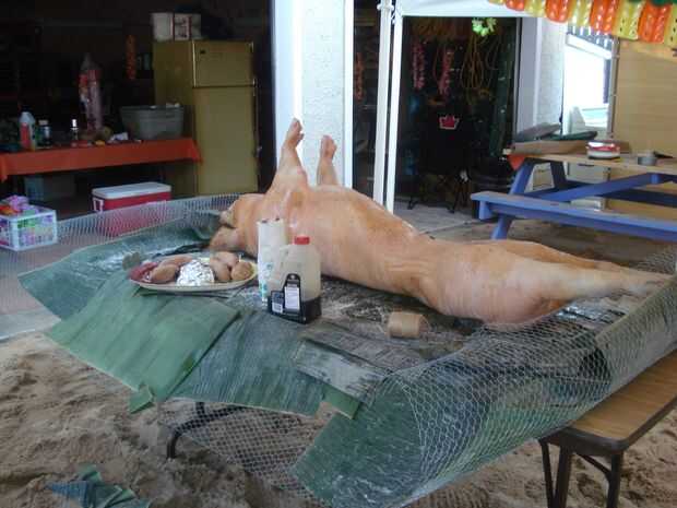 Tiempo de preparación del cerdo. Lugar el alambre de pollo hacia abajo en la mesa todos dispersos, coloque una bonita doble capa de hojas de plátano encima, luego colocar el cerdo encima de eso en está de vuelta. Cubra el cerdo con una capa de salsa de soja, aguardiente y alrededor de 5 libras de sal de roca. Línea interior del cerdo con hojas de plátano.