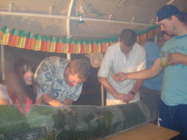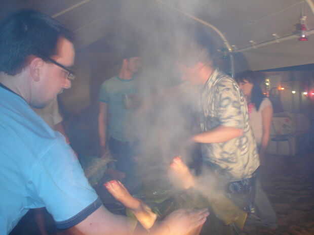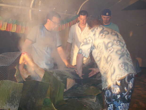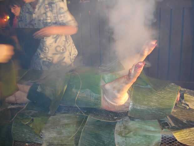 Encontrar los chicos además en el grupo; les dan palas y decirles para pescar algunas rocas incandescentes caiga en el estómago de cerdo hoja forrada de plátano. Vapor debe disparar fuera de todos los orificios de cerdos como una película de Looney Toons.