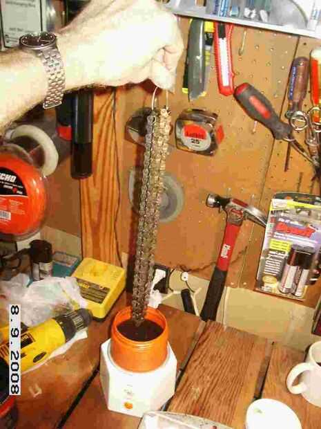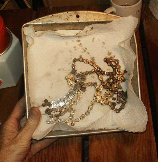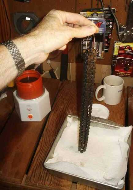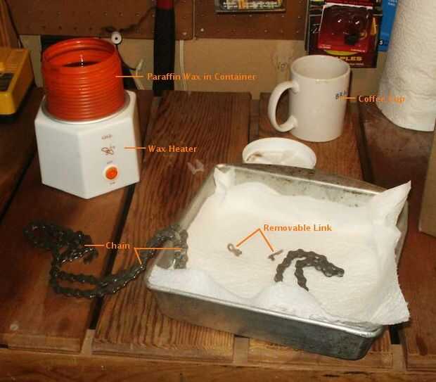 si está correctamente configurado, puede utilizar la cera de parafina para lubricar la cadena de su bicicleta. Las principales ventajas del método que uso (el sumergir la cadena en cera caliente) es que (una vez que estás establecido) es rápido, es fácil y produce una cadena que no coge polvo ni produce marcas grasosas "tatuaje" en usted o en su ropa. Por esta razón, me parece superior al petróleo. Lubrique mis cadenas así cada 3 semanas o 300 millas.