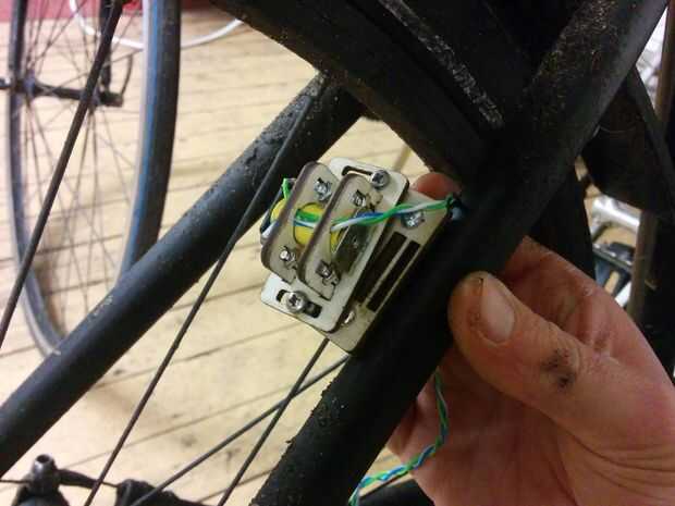 - Uno para sostener la bobina en el marco de la bici, cerca de la rueda de la bici