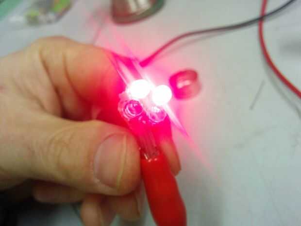 Te son dos LEDs (he probado también con cuatro LEDs, que es sólo un montón repetido de LEDs). Uno debe poner un cable positivo y negativo a la otra, el otro LED va en la dirección opuesta.