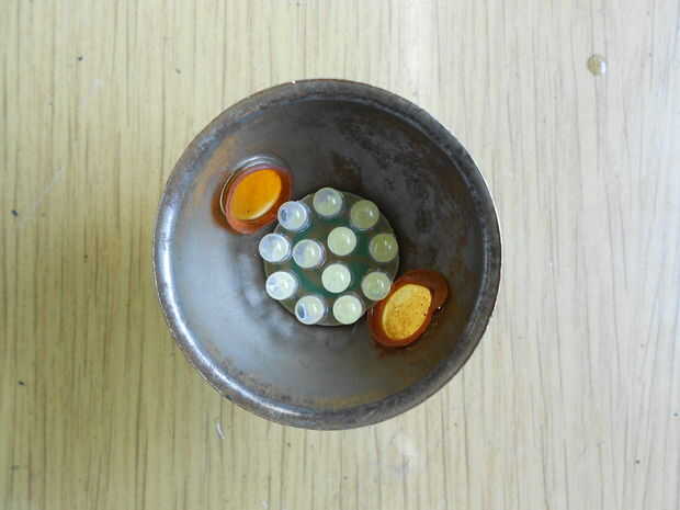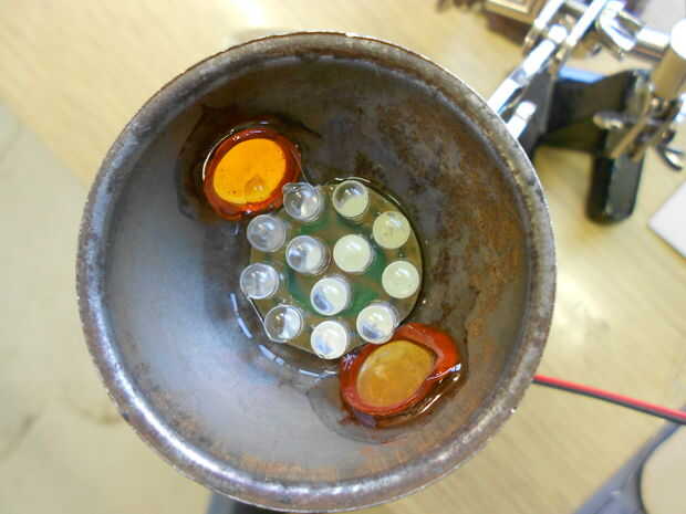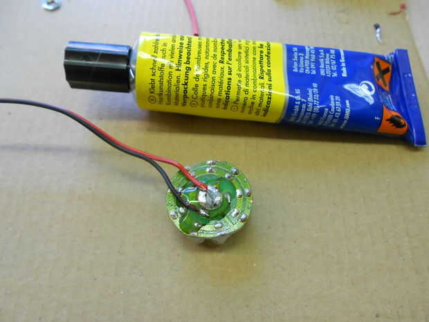 Tuve la suerte, que la placa de circuito con el LED fue un ajuste perfecto. Por lo que soldados de los alambres (el pegamento claro es para añadir una protección extra y reducir la tensión en los puntos de soldaduras) y pegado a la placa de circuito en la caja. Después de eso pongo anillo de cristal y el metal en lugar y doblar el anillo de nuevo (otra vez con un destornillador).