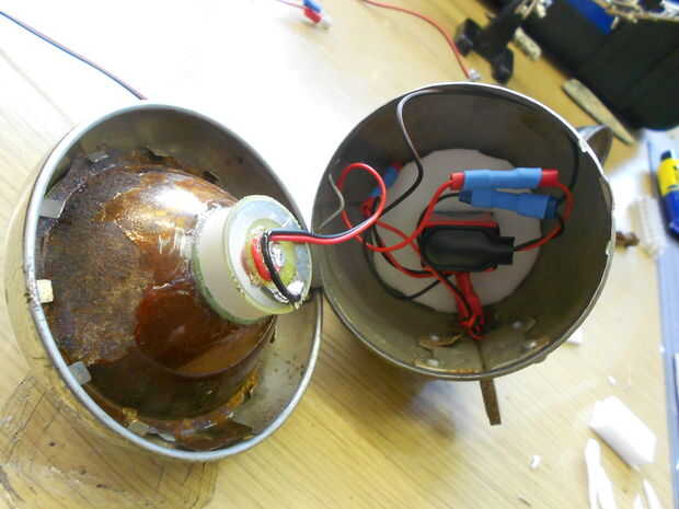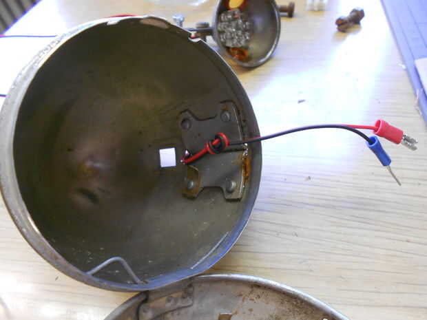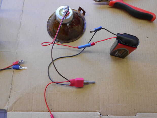 El frontlight era suficientemente grande para contener el reflector y la batería de 9V. Ya había un agujero pequeño, perfecto para el interruptor y otro espacio para ejecutar el canal de cable (tuve que cortar el conector ya está en marcha...). No olvide hacer un nudo en el cable en el interior de la lámpara para reducir la tensión.