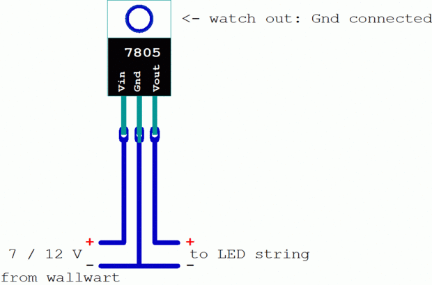 Un regulador de voltaje 7805 con cableado clásico fue utilizado con éxito.