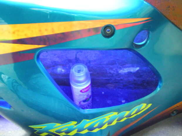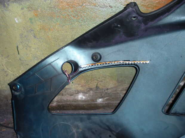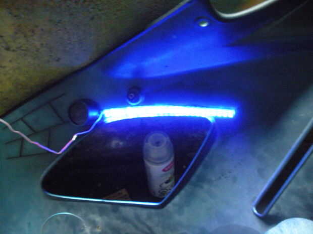 Tomar la tira de la luz y cortar una cantidad de ajuste de velcro, la misma longitud y anchura de la luz. Esto Coloque el LED en el carenado y ser desprendible, para que cuando se quita el carenado para hacer el mantenimiento, la luz puede ser atada y quitada fácilmente. No he tenido un problema con el calor cerca de los LED sin embargo por lo que no debería ser un problema en el futuro.