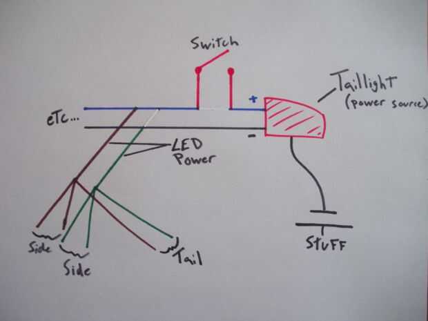 En cuanto a material técnico, cortar el cable positivo que viene de la fuente de energía después del elemento de la bicicleta (luz trasera, luz de matrícula) y antes de la tira de LED y extender el cable a ambos lados de las conexiones de los interruptores. Tuve que usar el ensayo y error para esto debido a la falta de un multímetro, pero convertir la moto en donde el LED se enciende normalmente y ambos lados del interruptor con los cables y a su vez llevar el interruptor de cualquier manera hasta encontrar un ajuste que enciende el LED encendido y apagado. Cinta y o / de la soldadura de las conexiones (no en ese orden...)