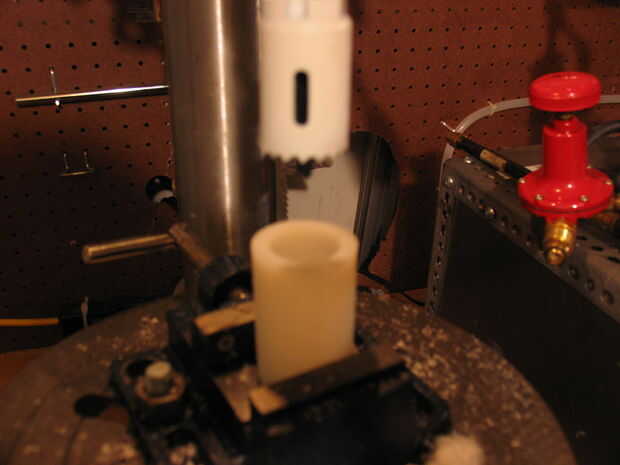 Es probable que, si usted ordenó su UHMW de McMaster - Carr, la barra no entra en el tubo. Es lo mío. Si no, es buena para usted, sólo usted puede omitir este paso. De lo contrario, quiere poner en el taladro (si usando un taladro de mano lo puso en un tornillo de banco) y poner ese 1 1/4" agujero broca en el portabrocas. Alinéela con la parte superior del tubo lo mejor que puede y luego desglosar appx. 3/4 de pulgada. Aquí es donde ese lil' bar stock pieza irá más adelante.