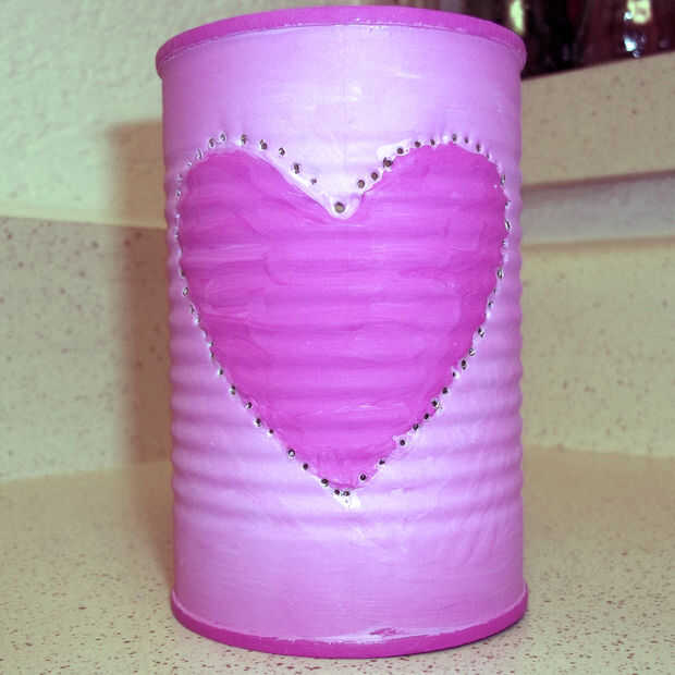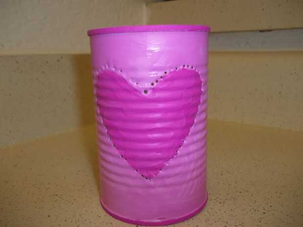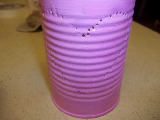 Ahora estás listo para pintar. Pinté la lata luz color de rosa y luego un rosa más oscuro alrededor de la parte superior e inferior y relleno en los corazones. Espere a que la pintura se seque y usar una tachuela o una aguja para meter la pintura de los orificios. Agregar una luz y disfruta!