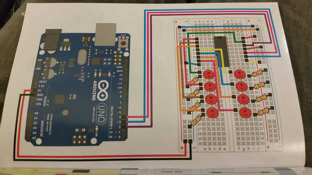 Conecte los cables, LEDs y registro de desplazamiento en el Arduino y protoboard como se muestra arriba.
