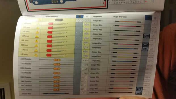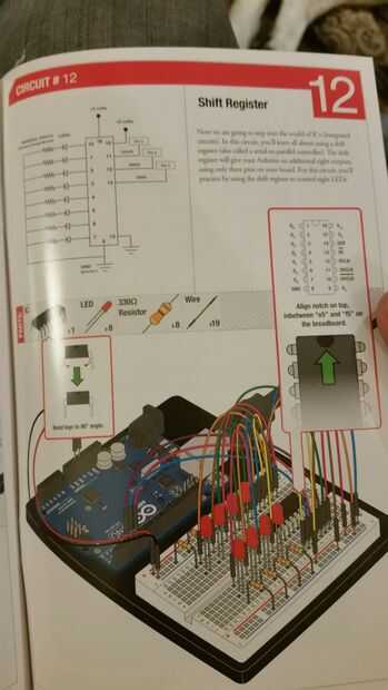 Tenga en cuenta que el círculo visible en un extremo del registro de desplazamiento hacia el borde más cercano de la protoboard y tratar de empujar el registro de desplazamiento en los agujeros apropiados como una acción fluida, en lugar de un conector a la vez. La tabla más baja de la foto detalles de las ubicación y el enchufe en puntos de cada pieza de hardware.