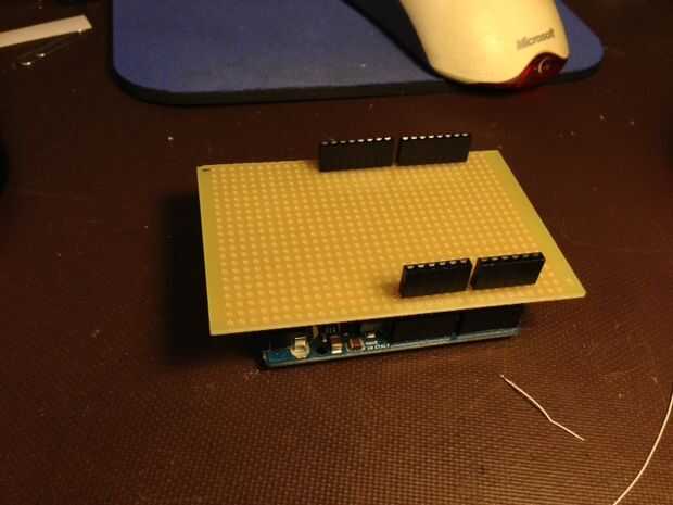 -Organizar las cuatro cabeceras de pasador largo de Arduino como se muestra en la imagen. Utilizar la Arduino Uno para ayudar a alinear las patillas largas en su lugar.