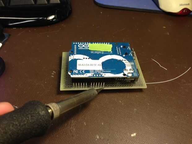-Voltee el ensamblaje y soldadura cada pin mientras que el escudo de proto todavía está conectado a Arduino Uno. Asegúrese de que los encabezados de negro se vuelcan a la protoboard como se suelde en el lugar.