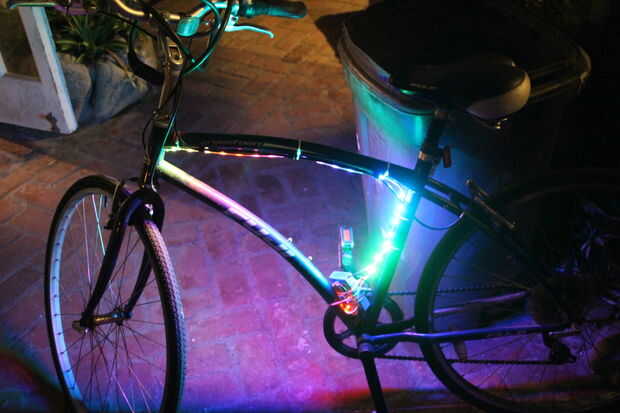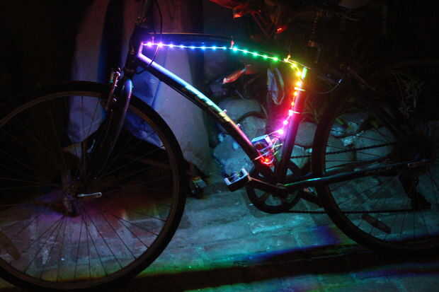 Esto significa que la mayoría de las veces, si quiero llegar a algún sitio que tengo que montar en mi bicicleta. Lamentablemente la mayoría de las veces monto en mi bici por la noche. Después de un par cuasi accidentes con coches usando estándar dólar tienda anteojeras, decidí actualizar. Usando una tira de luces LED programables, puedo jugar animaciones, efectos de partido fresco y mucho más con las luces en mi moto.