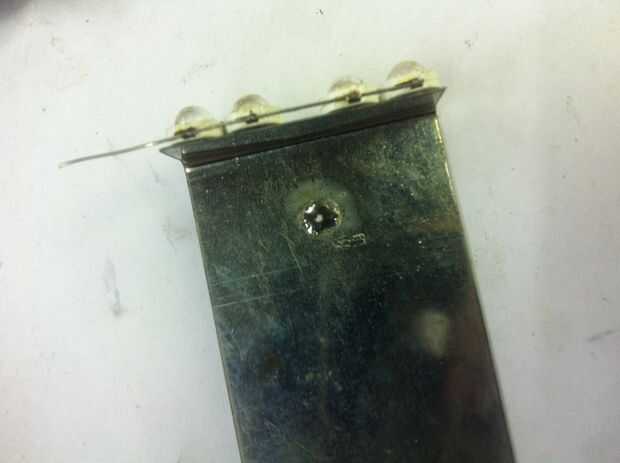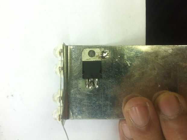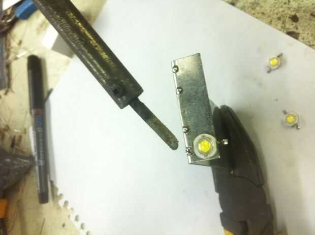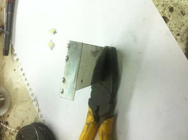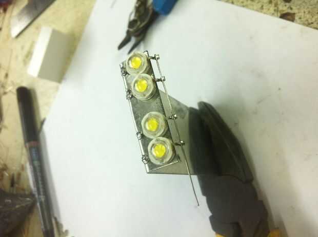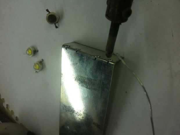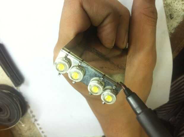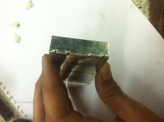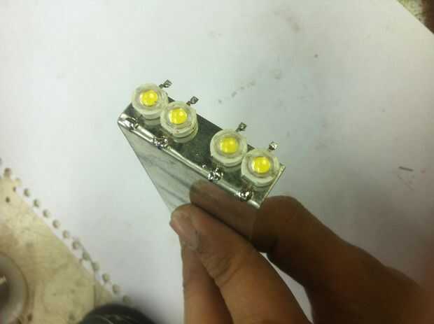 -confirmar los cátodos de 1 vatio led (marca negativa (-) en el terminal) y soldadura 4 1 vatio led en la hoja de hierro como se muestra en la imagen