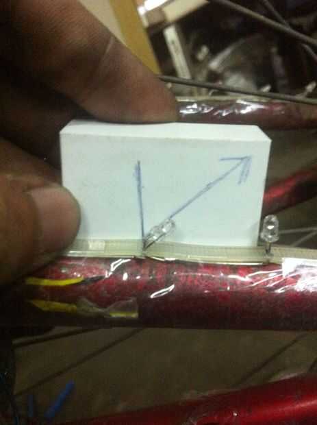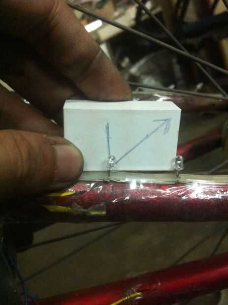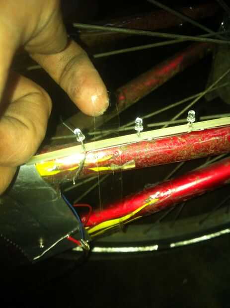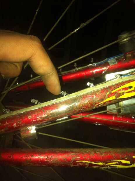 -Coloque la tira de led que hicimos en el marco trasero de la bicicleta y con la ayuda de cinta adhesiva transparente, cinta sólo de las diferencias de cada led como se muestra
