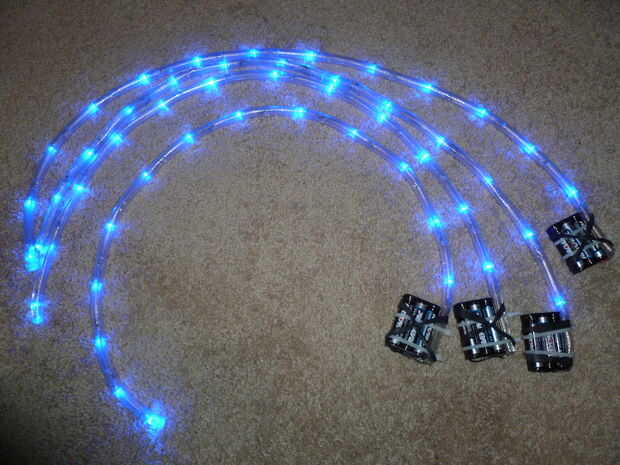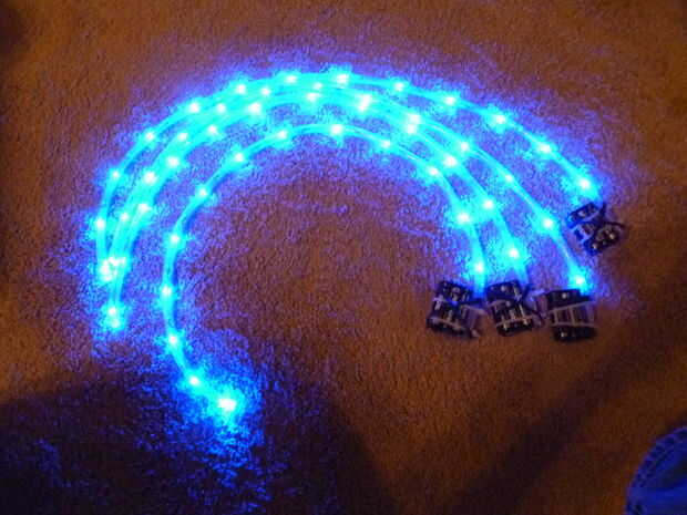 Una vez completas las cuatro secciones, había tejido de la cuerda en su lugar y envuelto en la banda de caucho alrededor un rayo para asegurar las baterías. Es resulta para ser muy fácil de añadir y quitar las luces.