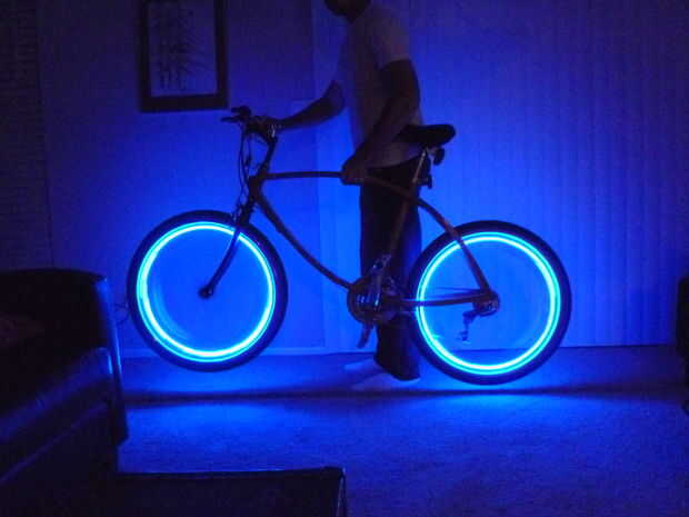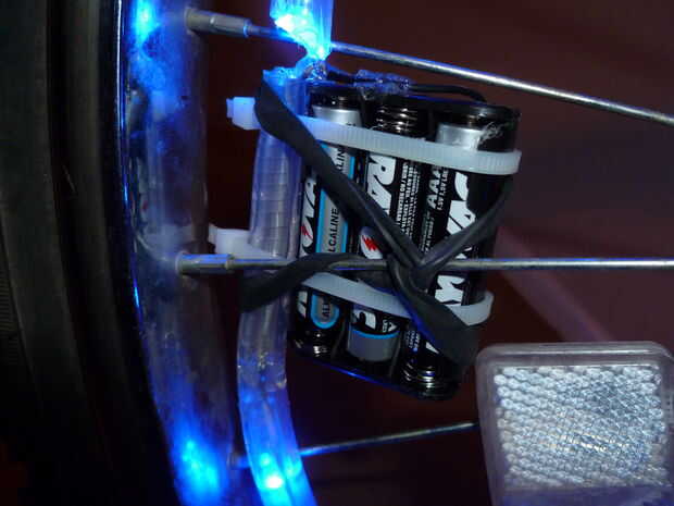 Para finalizar, utilicé alambre abrazaderas de plástico para mantener la batería en la cuerda del LED. Hice un lazo muy apretado y dejó uno lo suficientemente suelta para que se deslice sobre el para que pueda añadir y quitar las baterías. Para mantener la batería de tirarse alrededor de la rueda usé algunas bandas de goma de tubos de bicicleta antigua para fijar a un rayo.