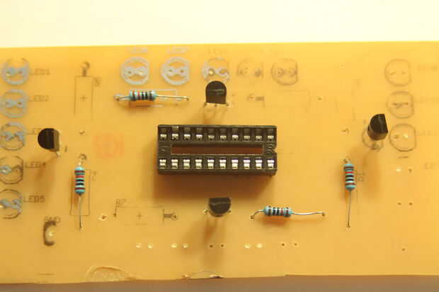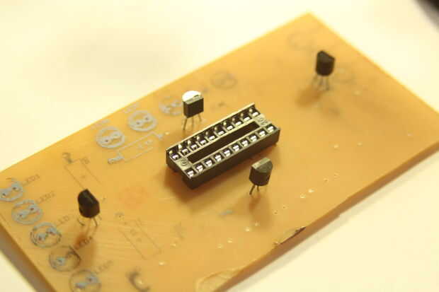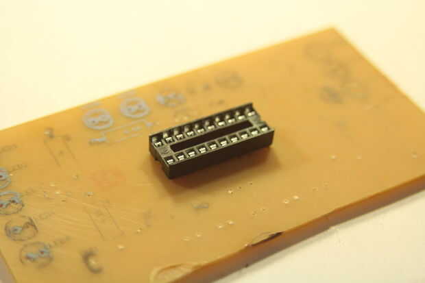 - Coloque el zócalo DIP IC 20 en el PCB e inclinarse todos los conductores a mantener en su lugar. Soldadura de pernos 3-6, 10 y 20 a la PCB.[Fotos 1A, 1B, 1C]