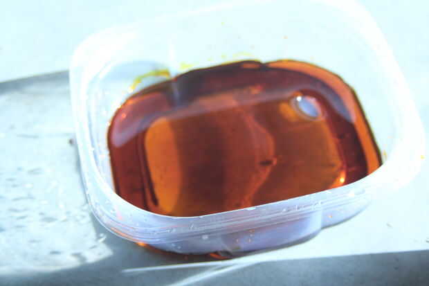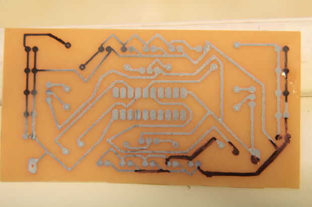 Tiempo para grabar! Primero salir a un área bien ventilada y ponga en sus guantes quirúrgicos. Vierta suficiente etchent para llenar un recipiente plástico pequeño y cubrir el PCB. Usted no necesita un montón de etchent, lo suficiente como para cubrir la Junta. Coloque el lado de circuito del tablero en el líquido. Ahora todo lo que tienes que hacer es simplemente dejar la Junta en unos 30-40 minutos y ya no, pero probablemente debería comprobar la junta cada 5 a 10 minutos y agitar el líquido. Usted debe comenzar a ver el cobre comienza a disolver el cobre bajo la tinta permanece en su lugar! Después de ha disuelto todo el cobre entre los rastros y los cojines, usando los guantes, retire la placa nueva. Lavar el PCB e inspeccione. Usted no debería tener ningunos rastros de cobre todavía conectados. Si hay que debe haber dejado en la solución de grabado más largo. Pero si tienes algunos puntos fueron el cobre no grabe todo el camino, tomar una hoja de afeitar o Dremel y quitar el cobre no deseado. Tenga cuidado de no cortar ningún rastro.