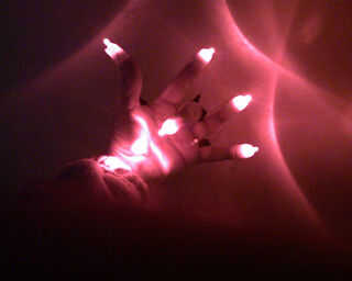 Dedo las luces son LED ' s rojos de moda a finales de Dedales de acolchado suave que van sobre el extremo de cada dedo. La esperanza es que el LED proporciona suficiente luz para que cada dedo debe ser visto en la oscuridad con el fin de permitir al usuario la habilidad de comunicarse con otra persona mientras sentado/mintiendo en la oscuridad. Al principio, mi idea era hacerlas recharable utilizando una tracción sistema (similar al cargador tirar OLPC) que obtiene de moda en algunos cool buscando pulseras de carga. Con este diseño actual, creo que es demasiado voluminosa. En última instancia me gustaría utilizar LEDs smd y algo menos torpes que los dedales de qulting suave.