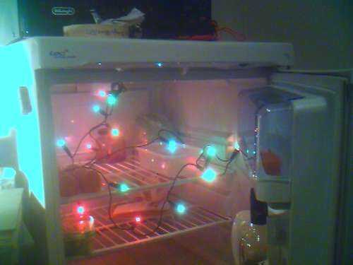 si tienes una nevera eléctrica entonces aquí es una modificación sencilla, sustituir la bombilla de 15W generalmente con una cadena de bombillas, de un sistema de luces de árbol de Navidad. en Irlanda y en Europa la alimentación 240VAC usé 20 Bombillas de 12V que cada uno conectado en serie, en Japón con 100 VCA 8 Bombillas serían buenas y en los Estados Unidos de 10 bulbos haría.