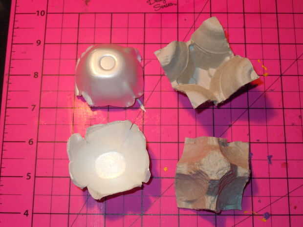 Con el cuchillo corte los cartones de huevo a lo largo de las líneas rojas en esta imagen. Con un cartón de la espuma de poliestireno, no cada copa hará una forma buena de flor. Esta caja Rinde 16 flor en forma de amapola. La caja de cartón a la derecha dará