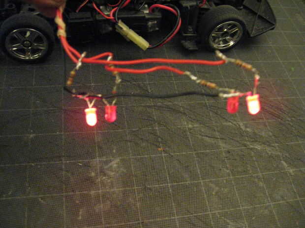 En cuanto a los cables, utilicé naturales blanco LEDs direccionales en el frente y helado LEDs rojos en los frenos.  Cada LED tiene una resistencia de 1 k en el positivo de la pierna o pierna más larga.   Esto será bueno hasta 12 juguetes de voltios.  Mi auto es una pila de voltios 7.2.  Colocar todos los LEDs en sus taladros y estirado alambre sólido (negro) a las piernas cortas o negativo.  El alambre sólido proporciona estabilidad en las luces y la habilidad para enfocar los LEDs más adelante.