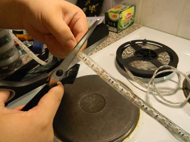 Corte la tira de led a la medida necesaria. Hay un punto de corte cada 3 LEDs. No corte en cualquier otro lugar o no funcionará. También hay los puntos de soldaduras en la parte posterior de la tira.