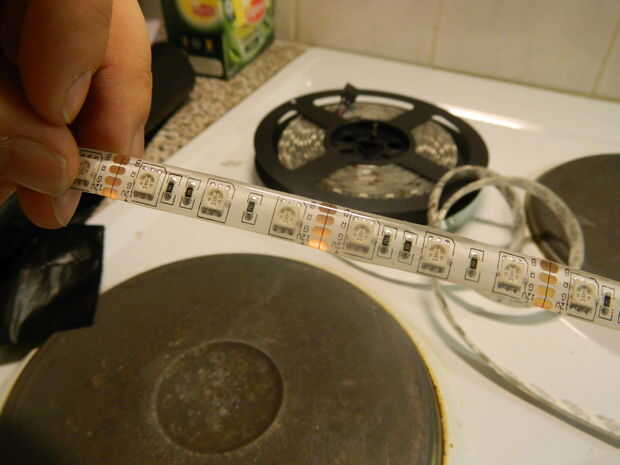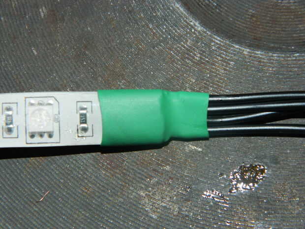 Cortan los cables de puenteo para la tira led. Asegúrese que los cables de la longitud correcta. Usted necesitará 4 cables para la tira de led. Hay 12 V de línea y para los leds (R) ed, (G) reen y (B) lue líneas. Los led es conducido con el cátodo.