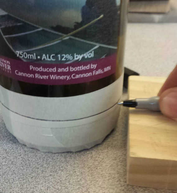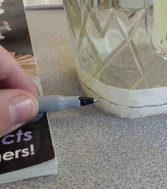 Trace una línea sobre la cinta cortar uso de corte. La línea tiene que estar por encima de la parte inferior de la botella de vidrio. Algunas botellas son más gruesas que otros.