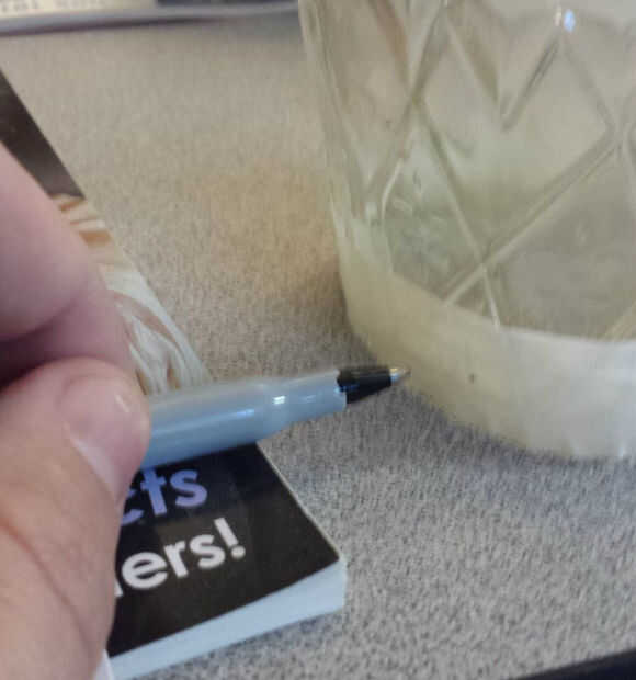 Lo dibujé una línea incluso fue a poner la pluma en un libro o un bloque de madera para darle la altura adecuada. Sujeta el lápiz inmóvil en el libro. Coloque la botella al lado de la pluma y girar la botella. Si tienes una mano firme que la marca estará al mismo nivel al girar la botella completa gire.