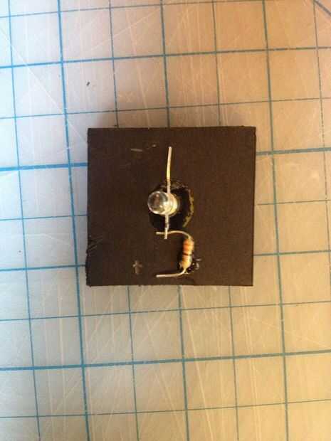 Enganche las patas de resistencias así y coloque en el lado positivo del LED, utilizando otra vez un punto de pegamento o cola caliente dab.